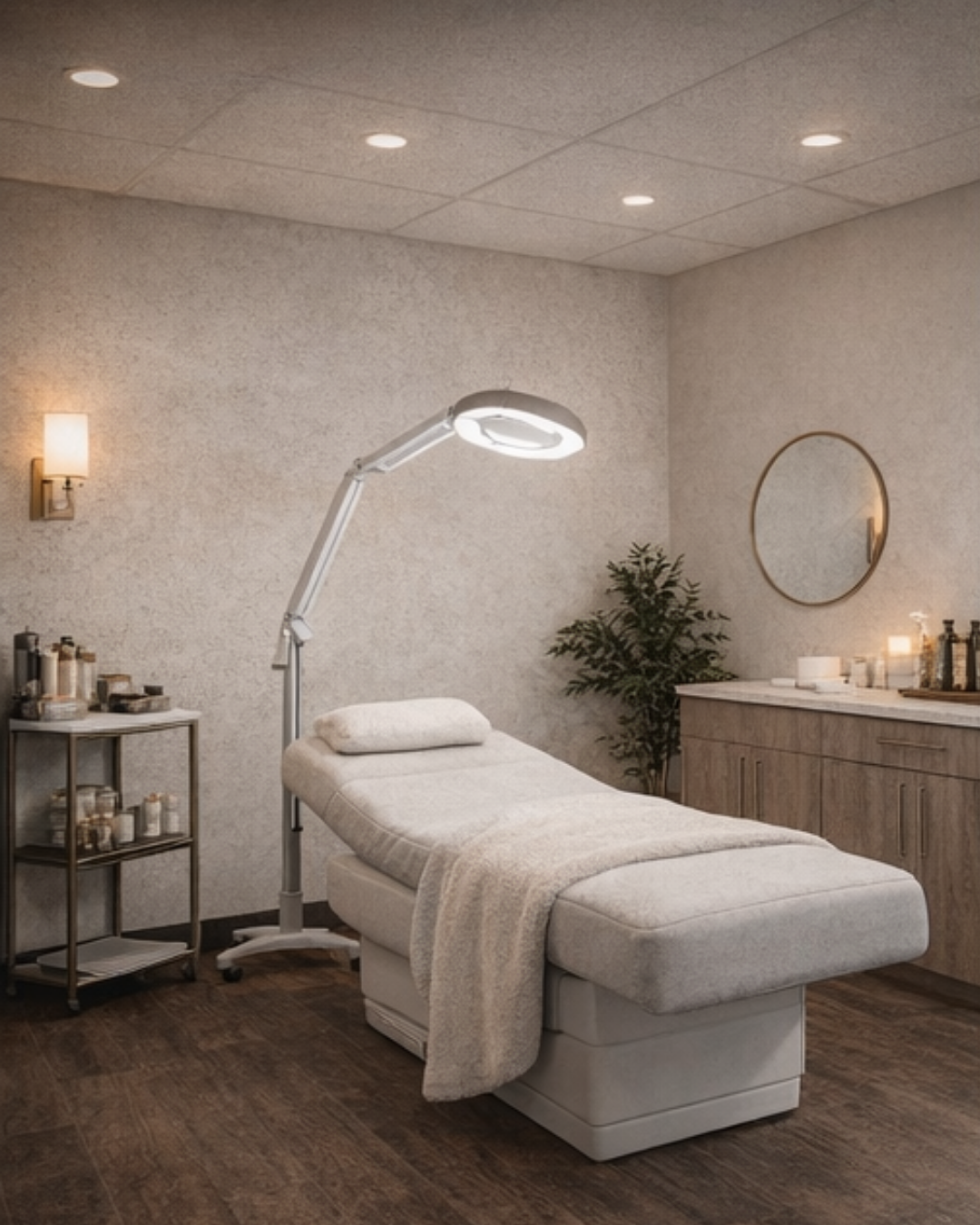 Beautifully designed treatment spaces featuring ergonomic electric beds, adjustable lighting, and calming, upscale interiors ideal for aesthetic treatments.